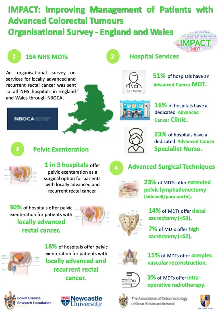 NBOCA collects data from all hospitals in England and Wales – so thanks to IMPACT, for the first time, we have a clear picture of services offered to late stage rectal cancer patients throughout these countries (Scottish and Northern Irish data is collected independently and is due in the future).